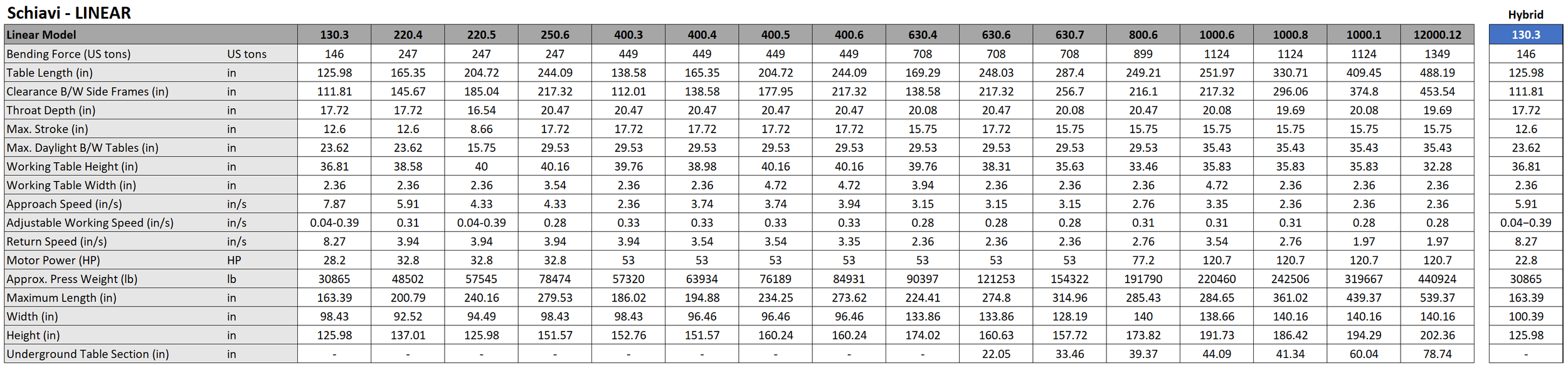 The LineAr range varies from 3 m 130 ton to 12 m 1200 ton.